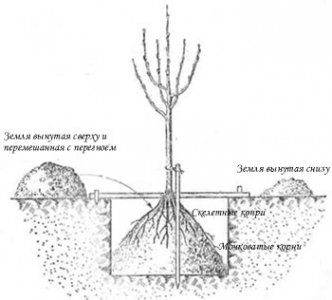При засыпании ямы вниз засыпают верхний слой почвы, вверх – нижний. В самом конце - почву аккуратно приминают и мульчируют перепревшим навозом или компостом, после чего подвязывают дерево к колу.