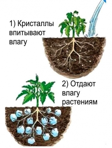 К сожалению, гель не порождает влагу в почве, а только аккумулирует внесенную с поливом. Исходя из этого, чтобы удовлетворить потребность растений в воде, поливы могут быть более редкими, но обильными.