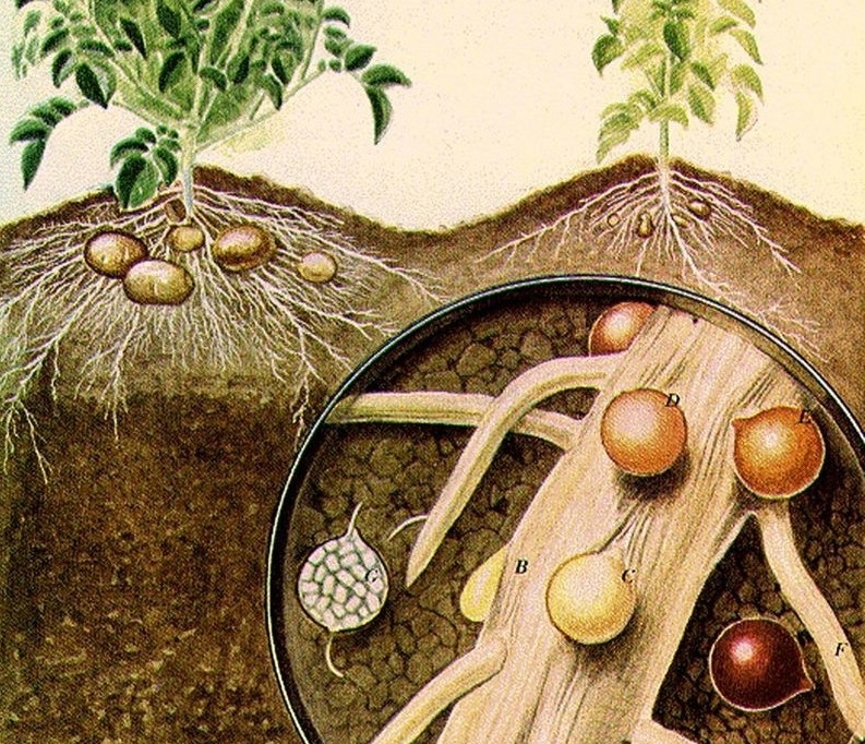 Золотистая нематода (Globodera rostochiensis) – крошечный червь, живущий на корнях растений семейства пасленовых: томатов, перца, баклажанов, дикого паслена. Но размножаться может только на корнях картофеля.