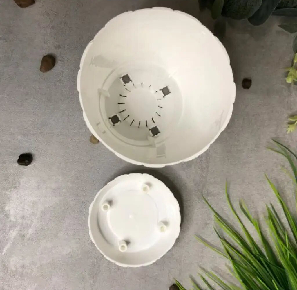 Небольшой пластиковый горшок с четырьмя дренажными отверстиями и подставкой в комплекте. Предназначен для выращивания маленьких комнатных цветов или других растений. Размеры горшка составляют 10,5x11,5 см.