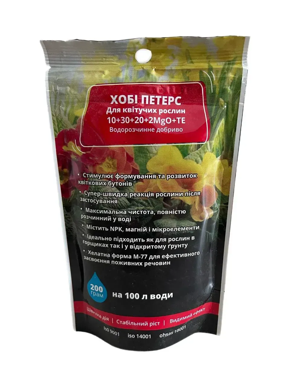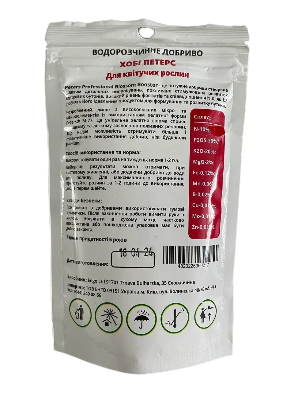 Формула Peters M‑77 содержит набор микроэлементов в хелатной форме, что обеспечивает мгновенное усвоение питания листьями и корневой системой даже при широком диапазоне. Удобрение подходит как для садовых, так и для комнатных растений и особенно эффективно в критические фазы бутонизации и цветения, когда потребность в фосфоре максимальна.