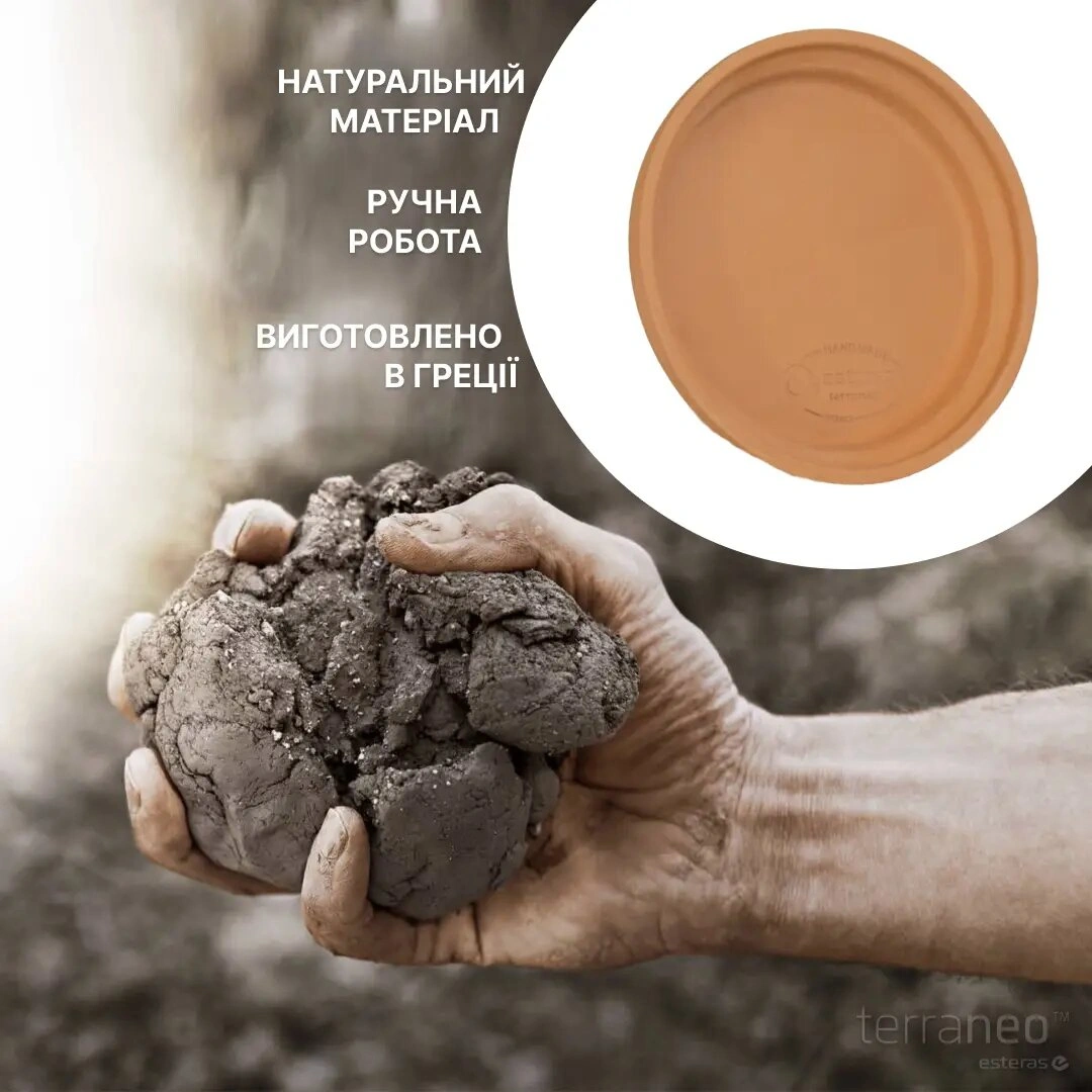При помощи подставки Terraneo вы сможете защитить поверхность, на которой расположен горшок с дренажными отверстиями. Грунт и воды из такого горшка будут попадать в подставку, а потому вам не придется постоянно мыть поверхность, где расположен горшок. Подставка изготовлена из натуральной глины. Она очень прочная, морозостойкая и долговечная. Кроме того, у нее сдержанный терракотовый окрас и приятный рельефный дизайн.
