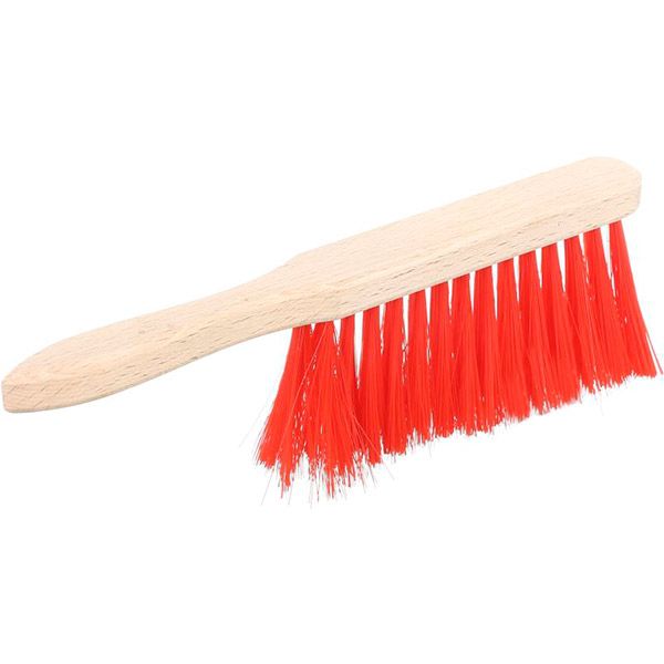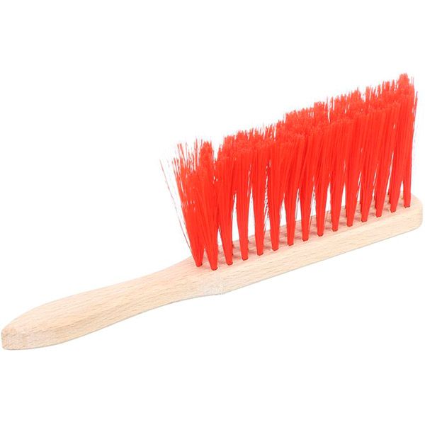 Деревянная щетка с тремя рядами ворса из ПВХ для сметания мусора. С удобной эргономичной ручкой и длинным упругим ворсом красного цвета. Общая длина щетки составляет 25,5 см.