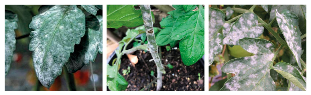 • на листках томатів з'являється білуватий або сіро-білий наліт, який нагадує борошно. Залежно від виду патогенну, захворювання може починатися та розповсюджуватися по різному;