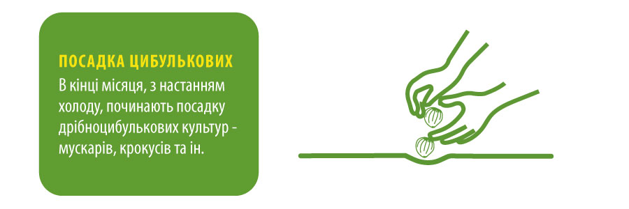 Хвойні рослини підживлюють осінніми добривами для хвойних культур, на початку місяця проводять обробки інсектицидами для боротьби зі шкідниками. Із закінченням вегетації проводять викопування цибулькових, перебирання і закладку на зберігання цибулин, бульб і кореневищ. Перед закладанням в підвал підсушують їх, і обробляють інсекто-фунгіцидом Cелест- топ, або фунгіцидом Максим. В кінці місяця готують клумби для посадки цибулькових культур. Вносять в них осінні фосфорно-калійні добрива, компост, садовий торф. В кінці місяця, з настанням похолодання, починають посадку дрібноцибулевих культур - мускарів, крокусів та ін. Відмінна ідея для посадки будь-яких цибулькових - висадка в кошики, які захищають бульби від мишей і заглиблення, роблять дуже зручним викопування рослин.