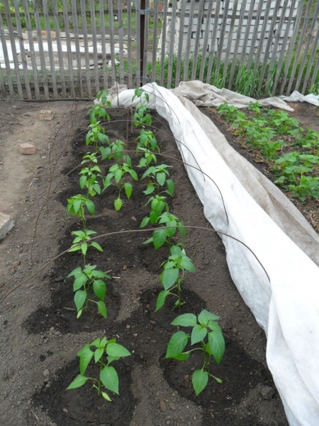 На грядці розподіляють місця для майбутніх рослин і копають на їх місці лунки об'ємом 5-7 літрів. Перці добре почуваються при висадці за схемою 30х50 або 40х60 см.