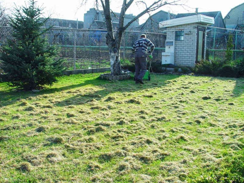 Проводять її граблями для газону або машиною для скарификации і аерації .