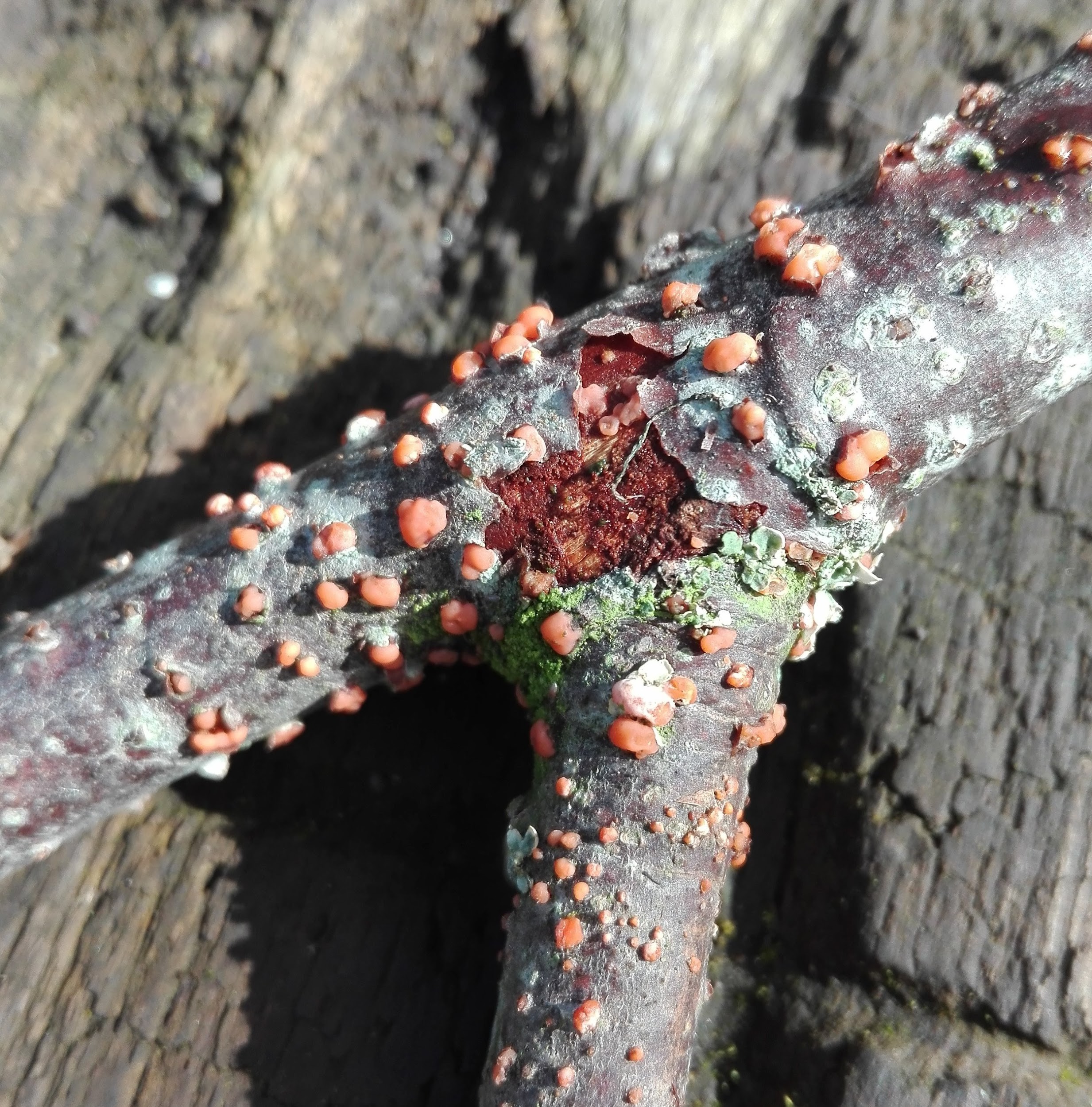Рожеві нарости на гілці вишні - це ознака коралової плямистості
