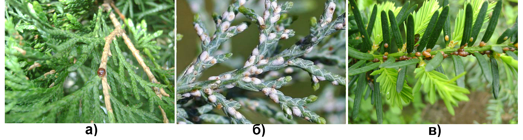 Щитівка на: а) туї; б) ялівці; в) тисі.