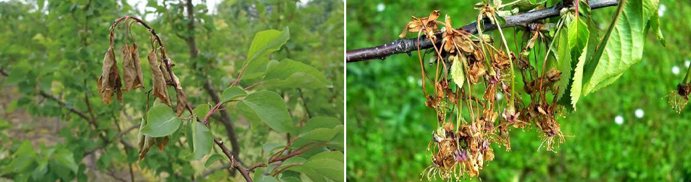 Навесні хвороба проявляється побурінням і всиханням цвіту, молодих пагонів і листя. При цьому плодові гілочки та пагони поточного року можуть повністю відмирати.