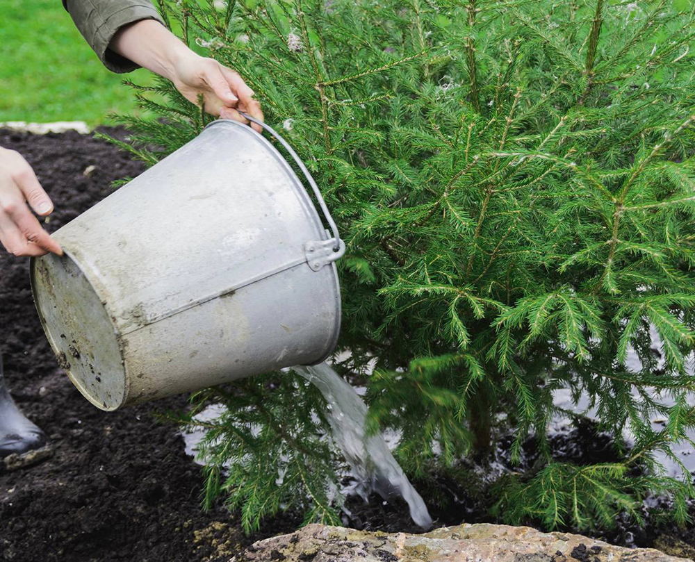 Для поливу хвойних рослин застосовують Майстер для хвойних (25 г на 10 л води). Норма внесення добрива 10 л розчину на 1 погонний метр рослини або на 2-3 річну рослину. Полив повторюють 2 рази, протягом весни. Rost Sour для хвойних також вносять шляхом поливу, для цього 20 мл добрива розчиняють в 10 л води та поливають рослини. Особливістю цього добрива є те, що його внесення дозволяє створити необхідну кислотність ґрунту для хвойних рослин.