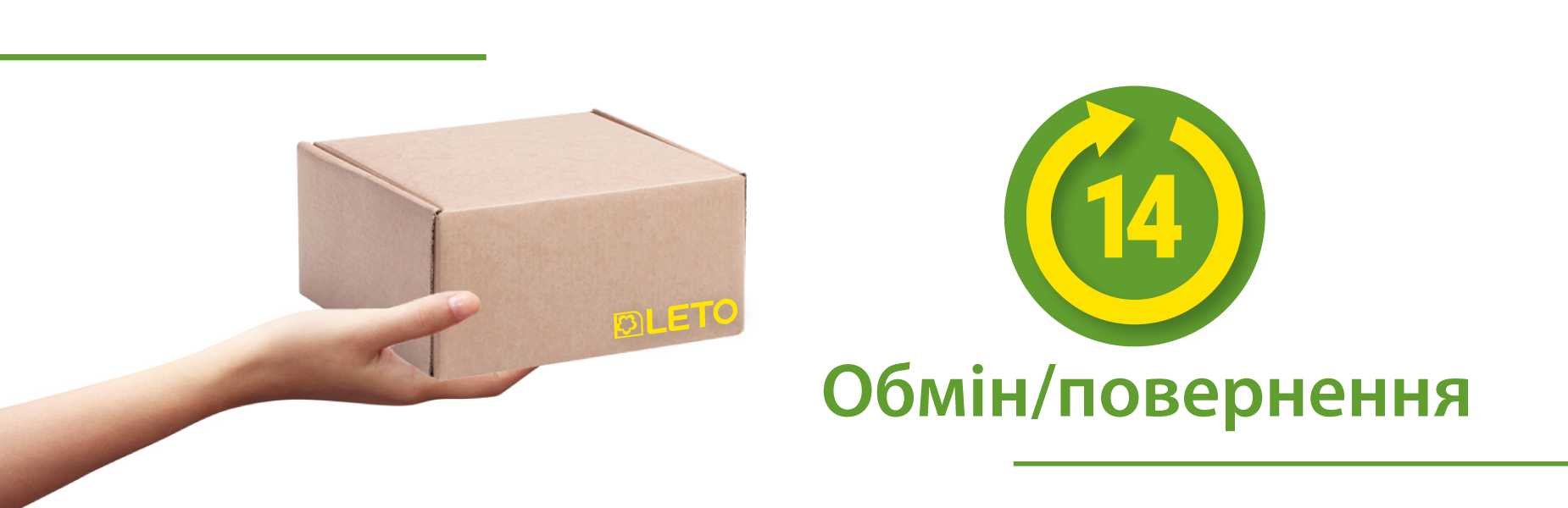 Товари, придбані в інтернет-магазині і в роздрібних магазинах LETO, можна повернути відповідно до закону України "Про захист прав споживачів" (вийняток - товари, які не підлягають обміну та поверненню згідно "Постанови №172 КМУ").